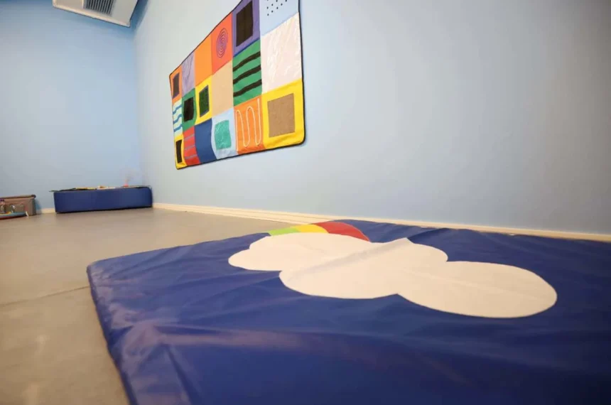 O ambiente também conta com tapetes de diferentes texturas, tatame vinílico e elementos de conforto físico, criando uma experiência mais segura e reguladora para o corpo e para a percepção sensorial dos usuários.
