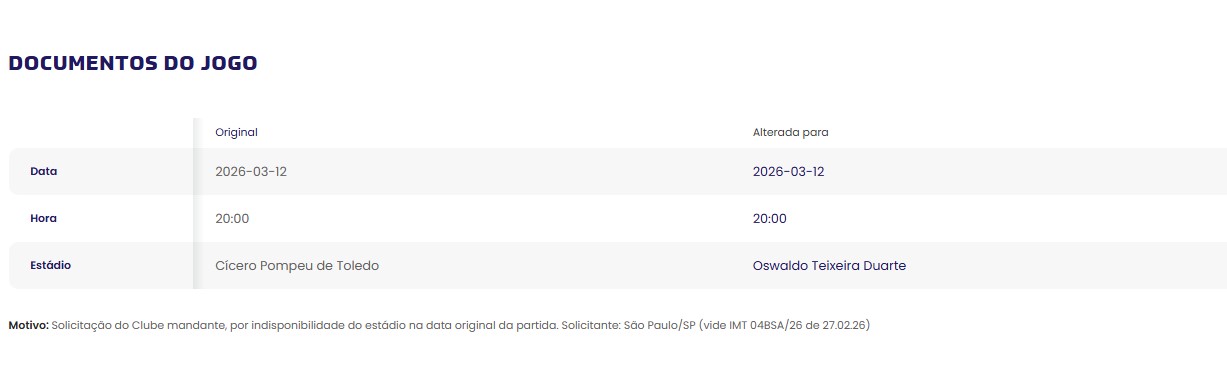 Na noite desta sexta-feira, 27, a CBF divulgou que o São Paulo realizará sua próxima partida no Canindé. O anúncio evidencia uma mudança de ideia do clube: anteriormente, a diretoria estava pensando em jogar eventuais partidas que não pudesse ser no MorumBIS no Brinco de Ouro da Princera, em Campinas.