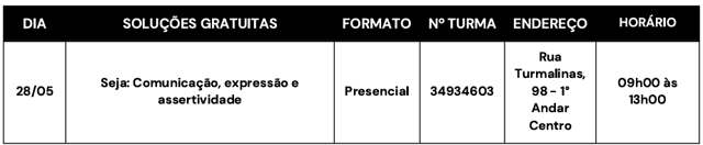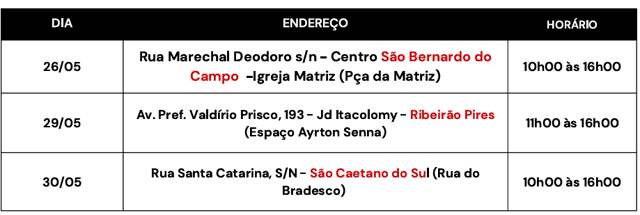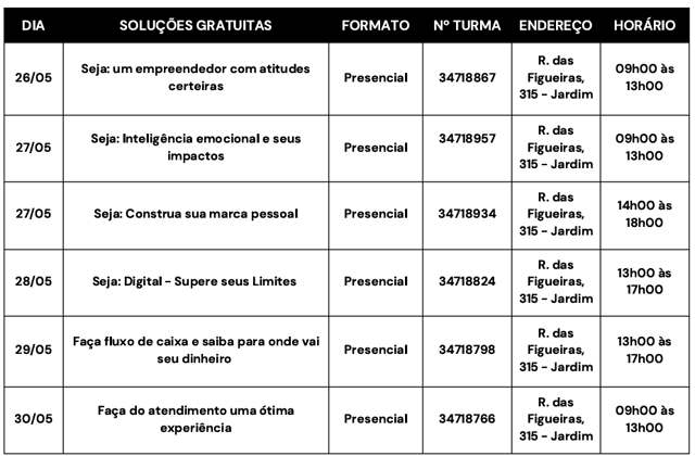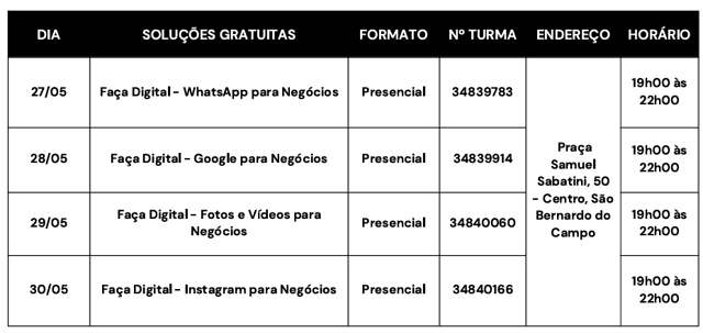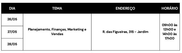 Outra atividade prevista é uma consultoria gratuita para quem quer ter mais informações sobre planejamento, finanças, marketing e vendas. O atendimento será realizado nos dias 26, 27 e 28 de maio, no escritório regional do Grande ABC, em Santo André, das 9h às 12h e das 14h às 17h. Os interessados não precisam de cadastrar previamente, basta comparecer ao local dentro do horário programado.