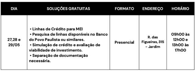 Uma equipe do Banco do Povo Paulista também participa da ação para dar esclarecimentos sobre linhas de créditos disponíveis para MEIs e os requisitos e documentos necessários para adquirir o empréstimo. Vale lembrar, que o Banco do Povo é um programa de microcrédito desenvolvido pelo governo pelo governo estadual, em parceria com as prefeituras.