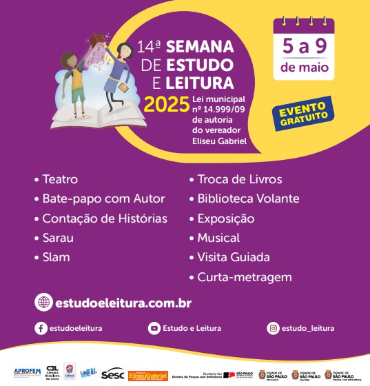A Semana Municipal de Incentivo e Orientação ao Estudo e à Leitura faz parte do Calendário Oficial de Eventos da Cidade de São Paulo em razão da Lei 14.999/09, de autoria do vereador Professor Eliseu Gabriel. Neste ano, em sua 14ª edição, ela acontece de 5 a 9 de maio de 2025, com atividades gratuitas, presenciais e on-line.