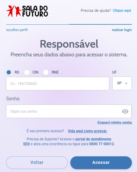 A ferramenta Sala do Futuro pode ser acessada pelos responsáveis por meio de aplicativo — sem uso de dados móveis para aqueles que têm telefones nas operadoras Claro e Vivo — ou pelo site. O login e a senha são os mesmos de acesso à Secretaria Escolar Digital (SED). É possível registrar o primeiro acesso e senha ou redefinir a senha no mesmo espaço, de forma simples e intuitiva. Se os responsáveis precisarem de apoio, podem pedir ajuda nas secretarias das escolas estaduais para acessar a aplicação.