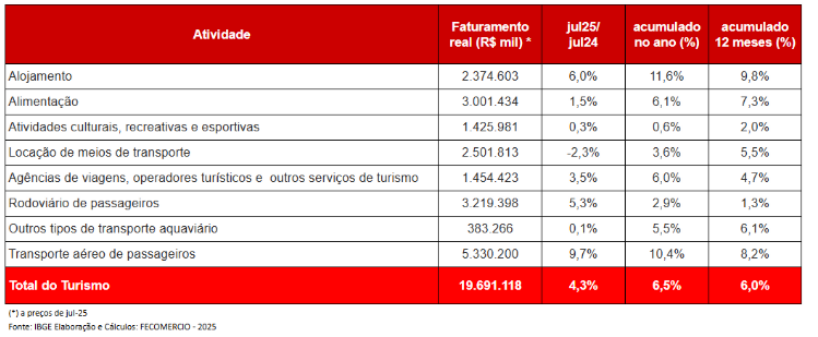 Como alternativa ao preço das passagens aéreas, o transporte rodoviário registrou expansão em julho, com alta de 5,3% em comparação com o mesmo mês do ano anterior e receita de R$ 3,2 bilhões. No mesmo período, as agências e operadoras de turismo cresceram 3,5%, movimentando R$ 1,5 bilhão — resultado que reforça a relevância do canal de intermediação para os consumidores que buscam segurança e praticidade nas viagens.