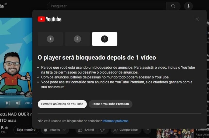 - Alertas Explícitos: O YouTube testou e implementou notificações diretas, alertando os usuários sobre a violação dos termos de serviço pelo uso de adblocks e impedindo a reprodução após um certo número de avisos.